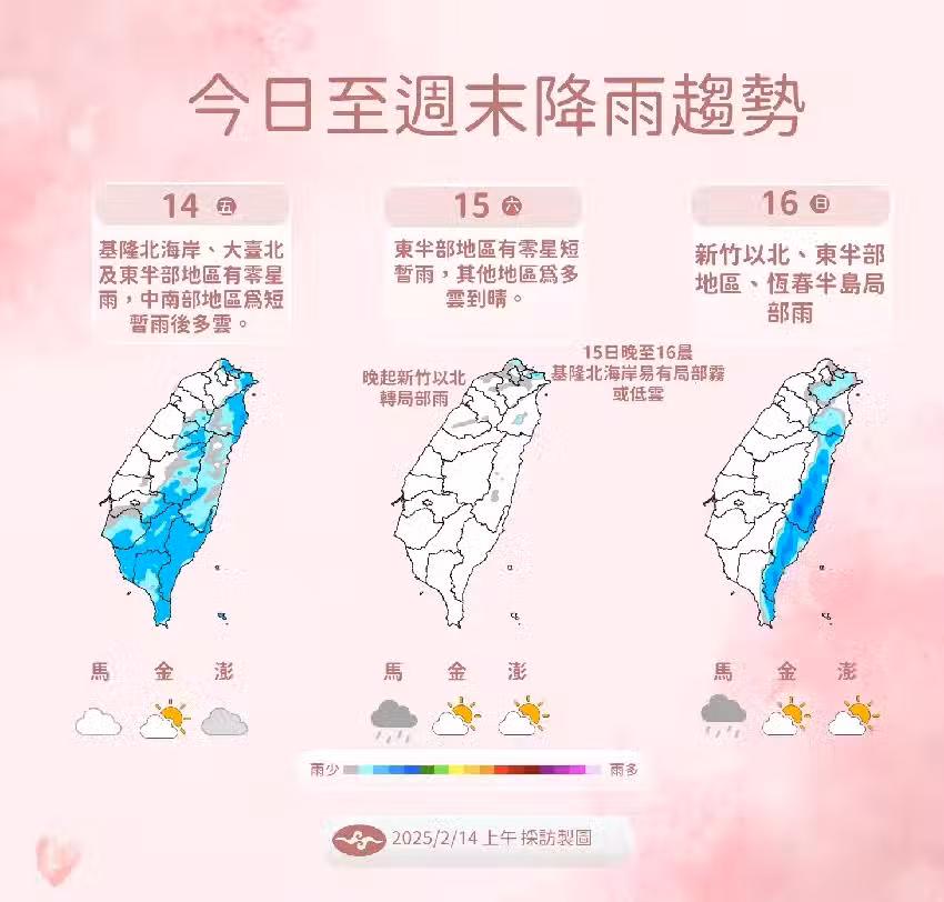 南部地區則要等到下半天才會從短暫雨轉為多雲天氣。