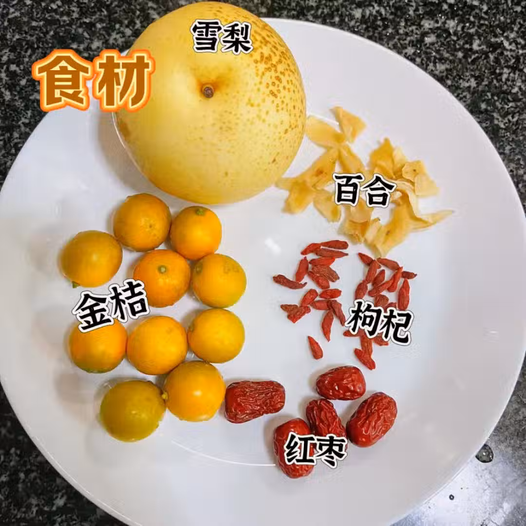 【做法】將食材清洗乾淨後,雪梨切片,金桔切十字刀,紅棗去核,所有食材一起放入鍋中,加500ml清水,先開大火,鍋開後轉中小火慢燉30分鐘左右,水開後用勺子撇去浮末。