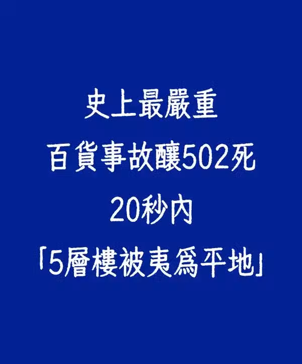 事實上,韓國的三豐百貨曾在1995年發生震驚國內外的倒塌事件,5層樓高的建築在短短20秒內垮塌,釀成502人罹難、937人受傷,損失約新台幣74億元,是全球百貨事故中最慘烈的。