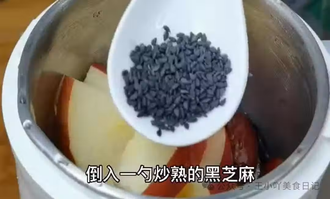 3.豆漿機製漿:將處理好的黑豆、黑米、蓮子、花生米倒入豆漿機中,隨後加入切好的蘋果塊和紅棗。接著,倒入500克左右的清水,再加入一勺炒熟的黑芝麻,不僅能增添營養,還能讓飲品更加香濃。