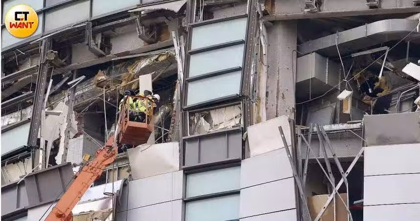 大型吊車進駐新光三越台中中港店,工人將外牆上較危險的懸空建材移至室內,避免掉落造成二次災害。(圖/CTWANT)