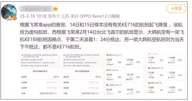 另一位網友也打假了,稱15號這天根本沒有有關KE716的航班起飛降落 ,該航班為虛構航班。------------------