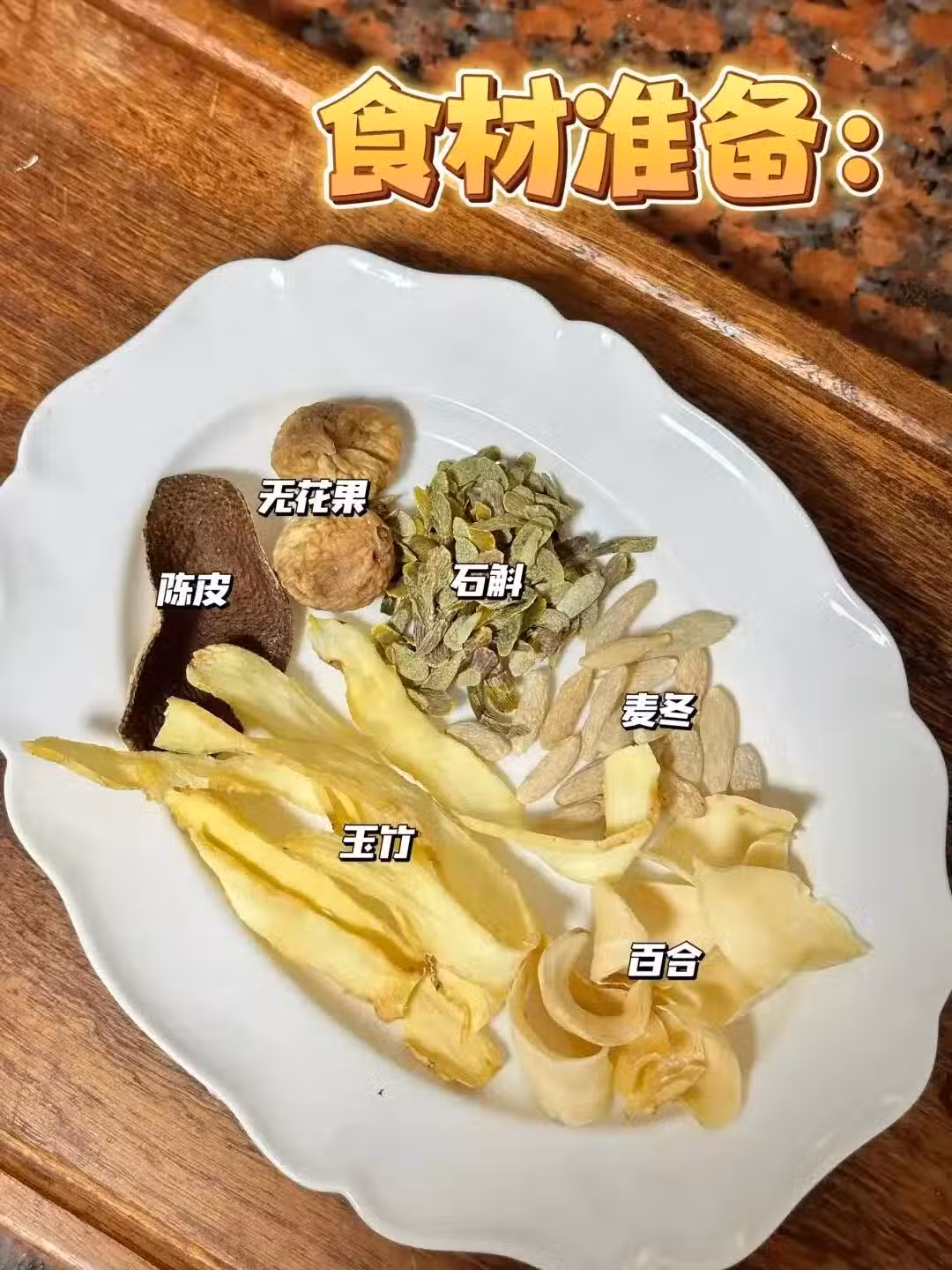 食材準備:將無花果洗凈,對半切開;玉竹、麥冬、百合、石斛、陳皮稍作沖洗,去除表面雜質;瘦肉洗凈,切成小塊。