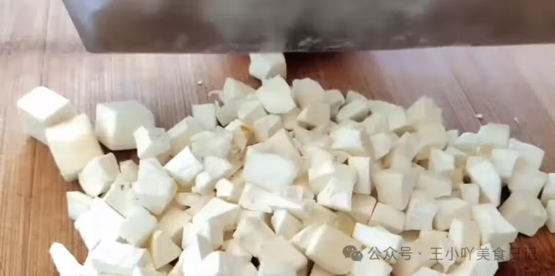 清洗後的茯苓,用刀切成小塊,這樣不僅能縮短煮制時間,還能讓茯苓的有效成分更好地釋放出來。