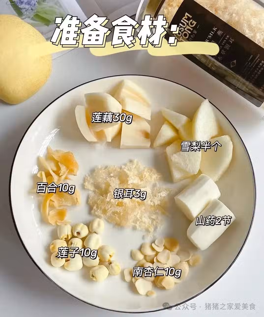 1.銀耳撕成小朵,山藥、雪梨、蓮藕切塊,其他食材洗凈。