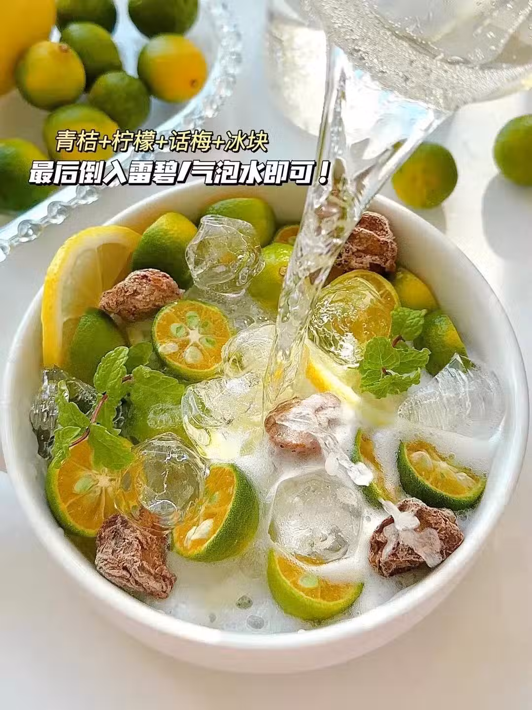2.青桔、檸檬、話梅裝進一個大水杯里,最後倒入雪碧即可