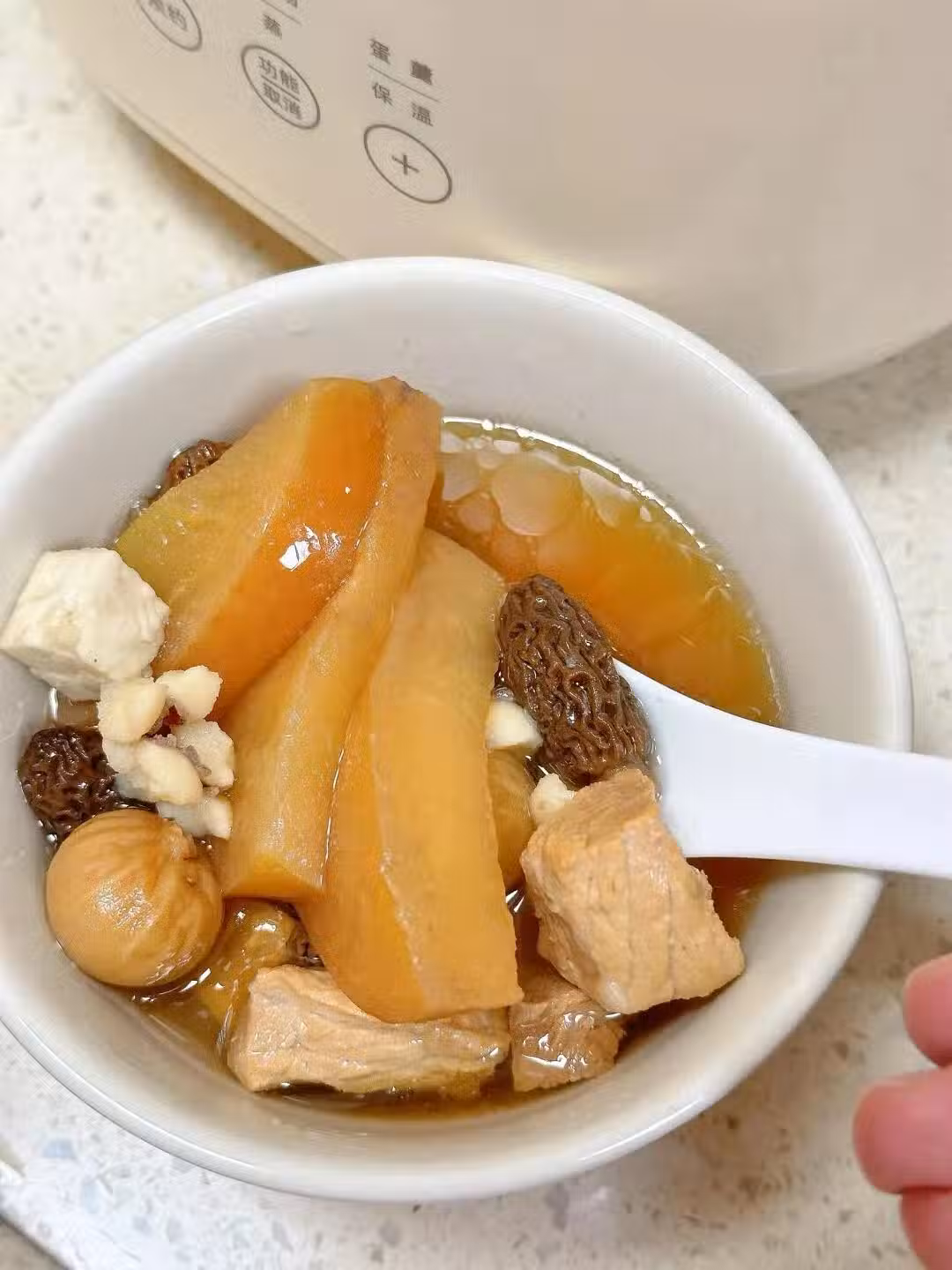 瘦肉焯水,蘋果去芯切塊,羊肚菌泡發洗乾淨,所有材料洗凈一併放進燉盅里,加入適量的清水,隔水燉2-2.5小時,出鍋前按個人喜好來調味即可。