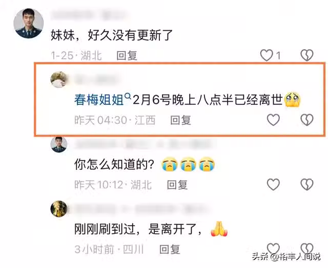 不過翻看其最近一條影片的留言處不難發現,原來相關的訊息早就傳出,知情人士透露,春梅去世的時間為2月6號上午八點,至於後事安排並沒有曝光。而在她1月時所上傳的最後一篇貼文中,她還寫道「又多活了一年!」誰知道 人生就是這樣,有的時候生命的消散會很突然。