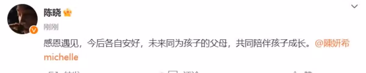 陳曉、陳妍希終於還是官宣了離婚消息。兩人分別發布了同款微博,表示:「感恩遇見,今後各自安好,未來同為孩子的父母,共同陪伴孩子成長。」
