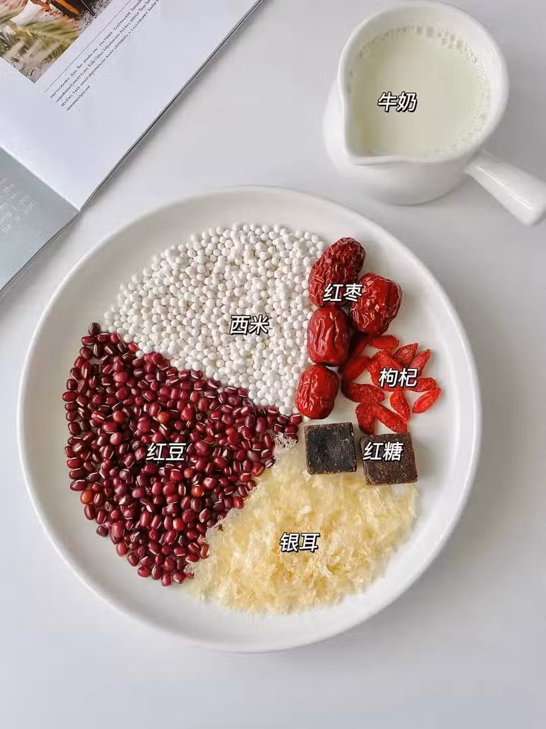 紅豆80g,西米120g,銀耳20g,紅糖20g,甘蔗水牛奶200g,紅棗4顆,枸杞適量