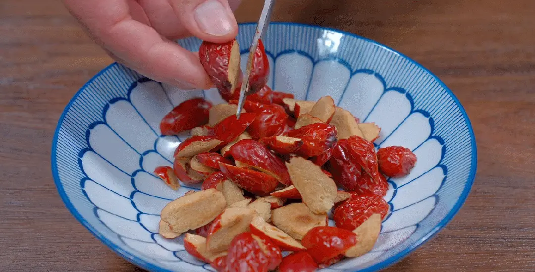 紅棗剪成小塊,去除棗核,紅棗的甘甜不僅能提升茶的口感,還能滋補氣血。