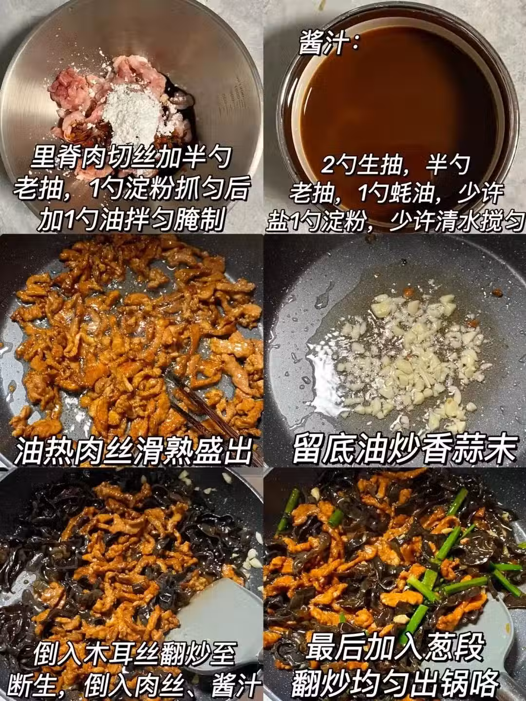 1️⃣準備食材:黑木耳泡發切絲,裡脊肉切絲加半勺老抽,1勺澱粉抓勻後加1勺油拌勻腌制,蔥、蒜切末。