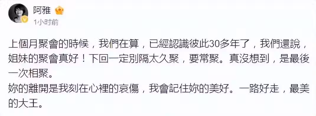 她說上個月才聚會,想著下一次別隔太久,要常聚。真沒有想是最後一次相聚,你的離開是我刻在心裡的哀傷,我會記住你的美好,一路走好,最美的大王。
