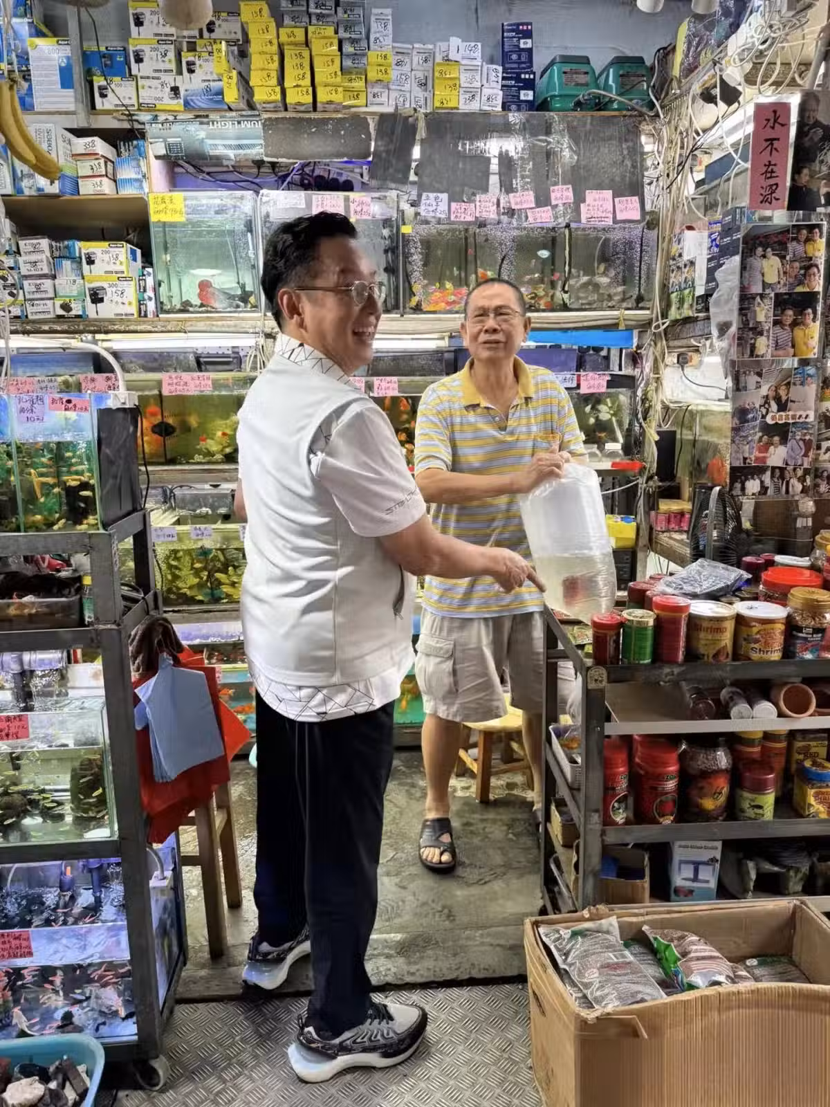 74歲譚詠麟到街邊小店,買了幾條金魚,不擺架子,和店主友好交談