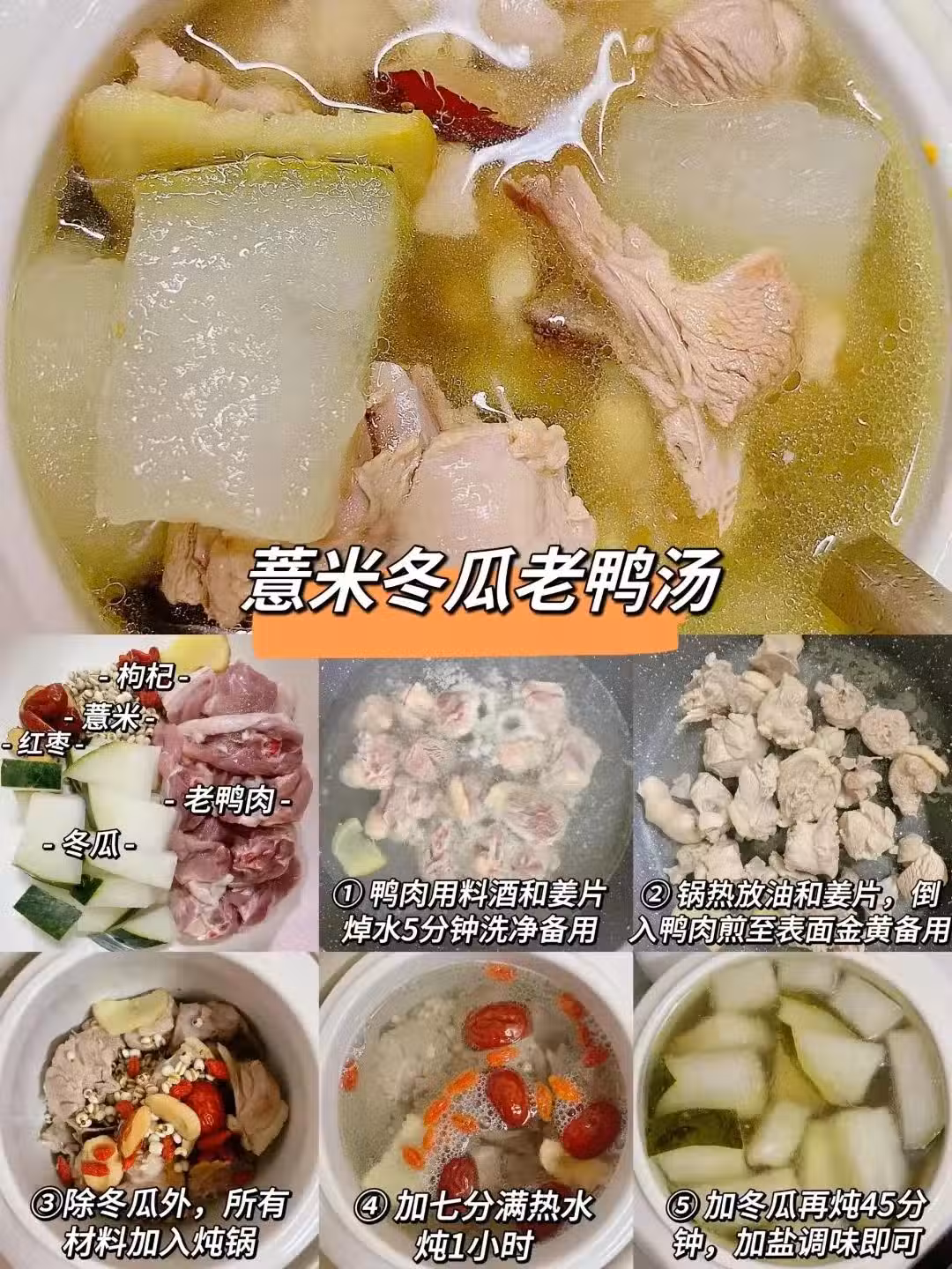 食材:老鴨半隻、薏米50克、冬瓜200克、枸杞少量、紅棗4-5顆、陳皮1片(可選)。 做法: 1、老鴨切塊,用料酒和薑片焯水5分鐘洗凈備用; 2、鍋熱放油和薑片爆香,隨後倒入鴨肉煎至表面金黃備用; 3、除冬瓜外,所有食材放入燉鍋,加七分滿熱水燉1小時; 4、加入冬瓜再燉45分鐘,出鍋前加少許鹽即可。 小貼士:老鴨偏涼,體質虛寒者可多加5片生薑驅寒。 三、雞骨草薏米豬骨湯 清熱利濕+護肝解毒,適合熬夜、應酬多的人。