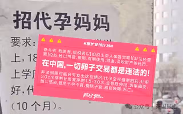 (反代孕貼紙) 去年年底媒體還曝光過新的取卵、代孕騙局。代孕團伙會假裝招聘人員在正規平台發布電子廠、服裝廠等高價崗位招聘信息,吸引年輕女性詢問。