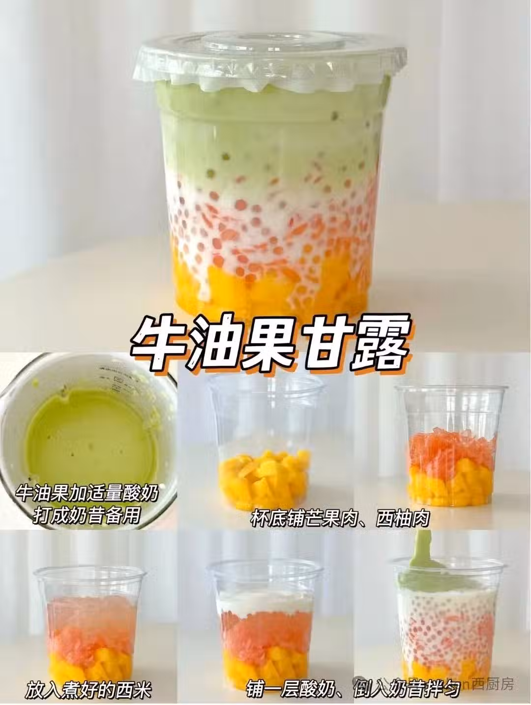 組裝飲品:在杯底依次鋪上芒果丁、西柚肉;放入煮好的西米;鋪一層約50克的酸奶;倒入牛油果奶昔,攪拌均勻即可。