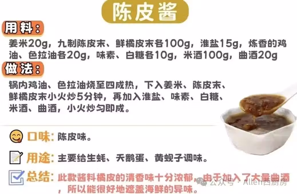 - 總結:橘皮清香味濃郁,因大量曲酒能很好遮蓋海鮮異味。