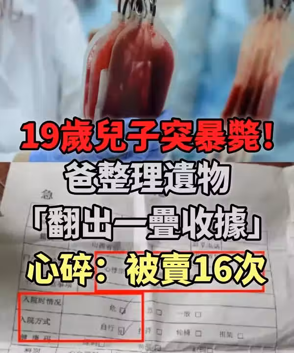 少年的父親隔天忍著悲痛整理兒子的遺物,卻在少年床底下發現一大疊收據,這才得知少年為了減輕家中負擔,生前一直在「賣血」。