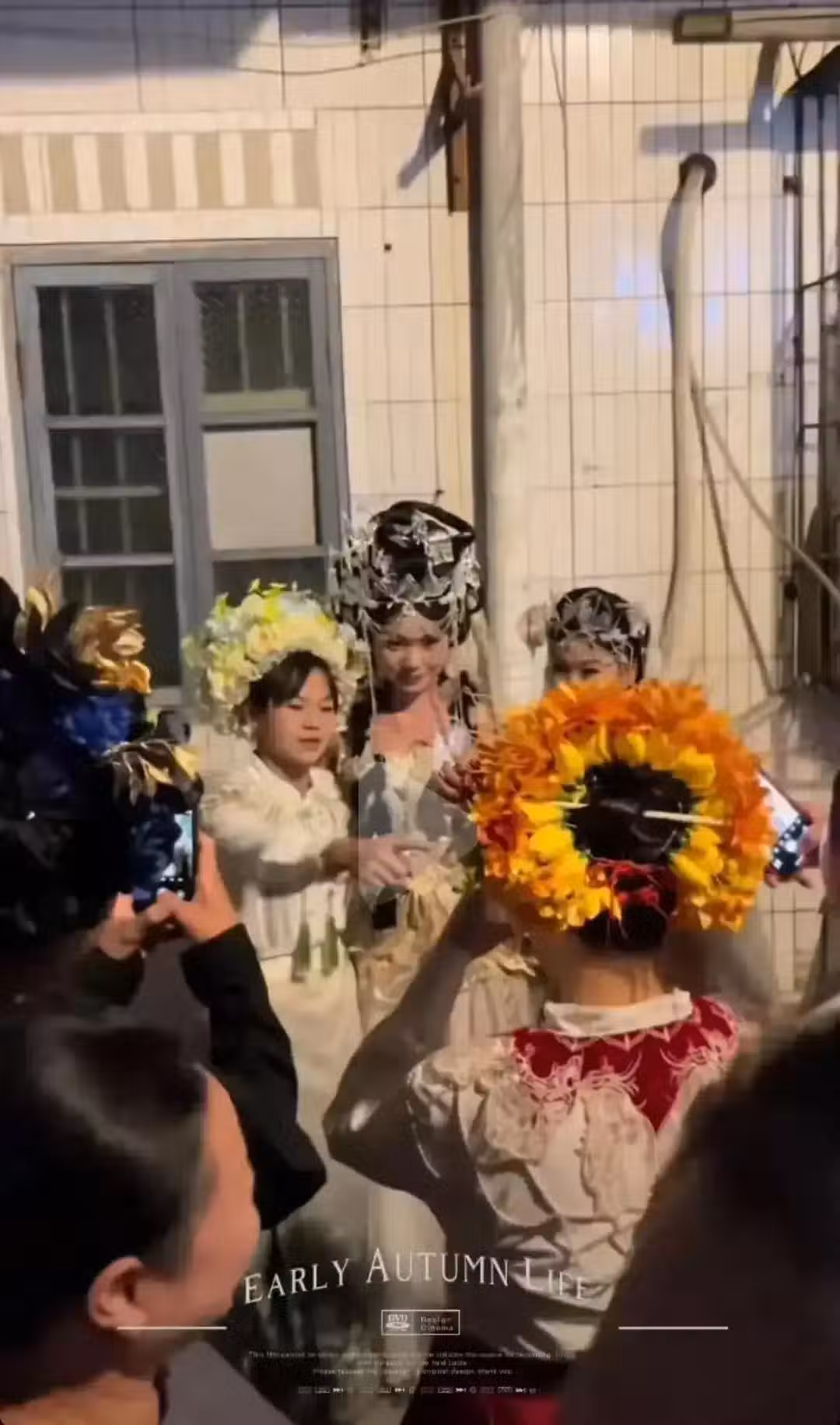 照片中,全氏姐弟共4人站在老街中央,各自手持一朵簪花,與其他4個人簪花相互插在對方頭髮中央。
