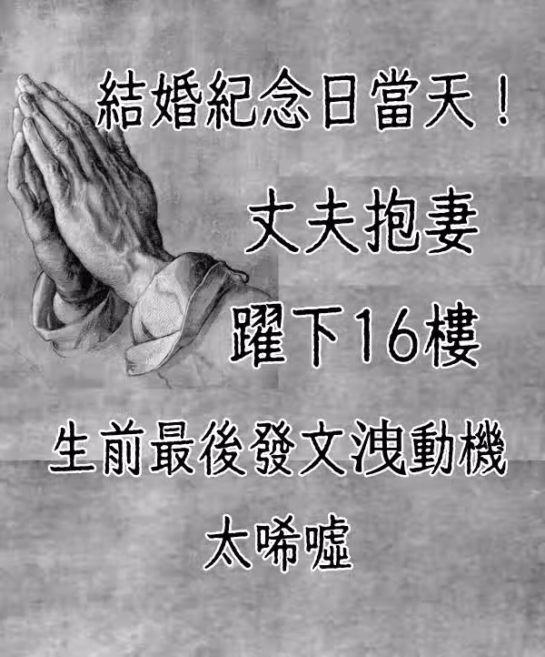 結婚紀念日當天!丈夫抱妻躍下16樓, 傷勢過重不冶而死