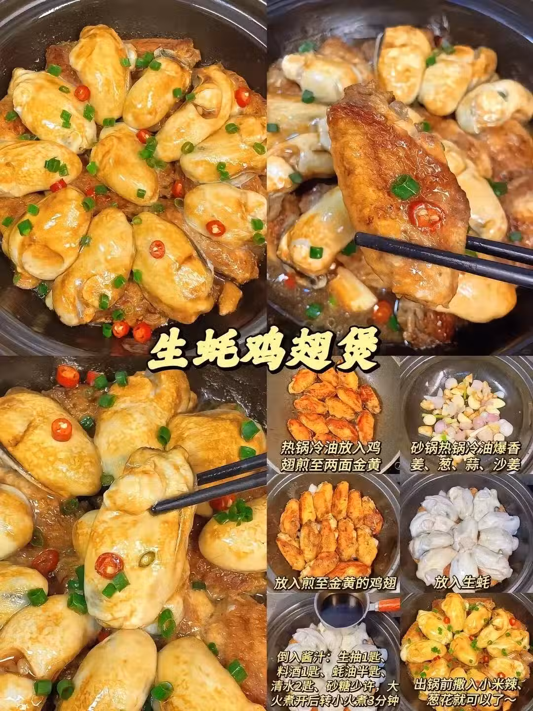 生蚝,男人的秘密武器,海鮮和陸鮮的叛逆聯姻,雞翅煎到金黃,蔥姜蒜等調料打底鋪滿砂鍋,再依次放入金黃的雞翅和鮮嫩的生蚝。