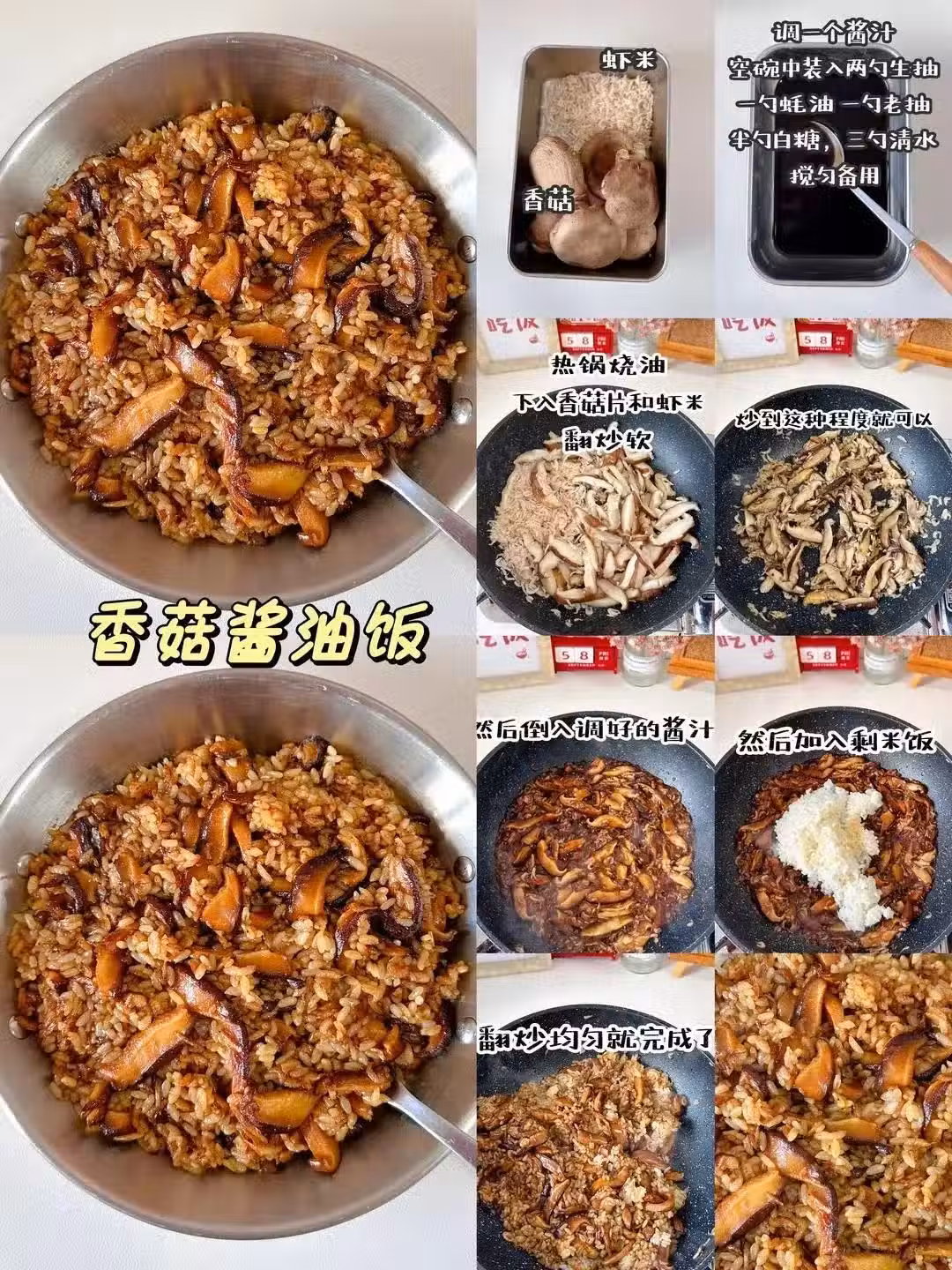 江湖人稱「醬油拌飯頂配版」。干香菇泡發切丁,熱油爆香,剩飯倒進去一頓翻炒,最後淋一圈醬油上色。米飯油亮亮裹滿醬香,香菇嚼著像肉,吃完碗底都想舔乾淨!