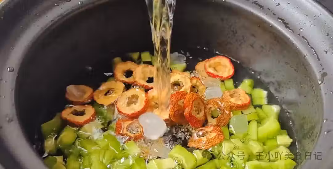 根據個人口味加入適量的冰糖,用以中和苦瓜的苦味和山楂的酸味,增添一絲甘甜。大火燒開後,轉小火慢燉10分鐘,讓食材的精華充分融合。