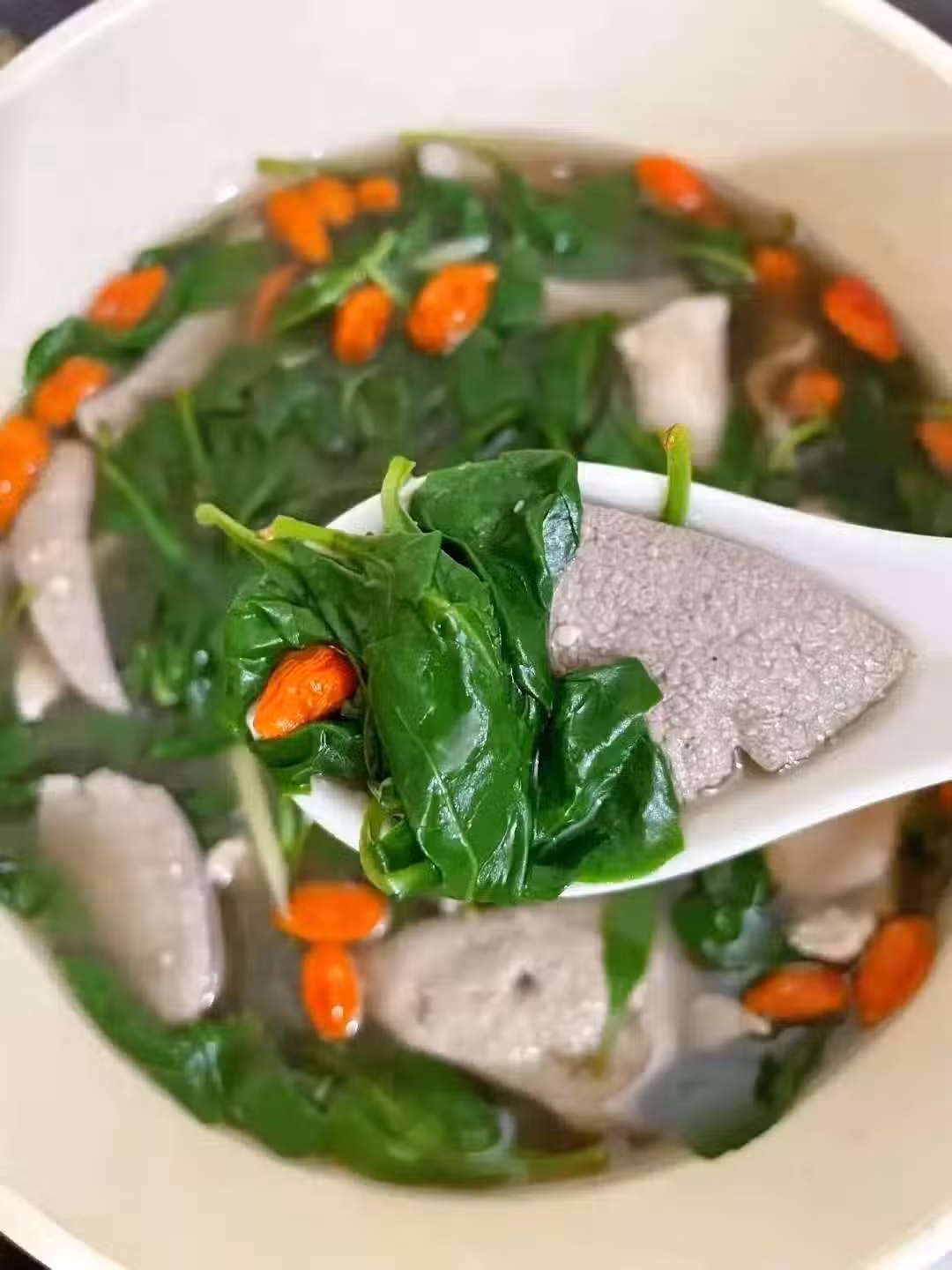 4️⃣ 重新燒水,下枸杞葉煮1分鐘,放豬肝+枸杞+鹽關火