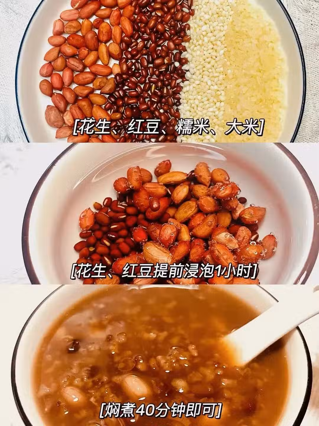 紅豆、花生先浸泡1小時,再和糯米、大米洗凈入鍋,煲40分鐘,起鍋前把紅糖放入倒入,再悶上5分鐘,香甜可口的紅豆花生糯米粥就好啦!!