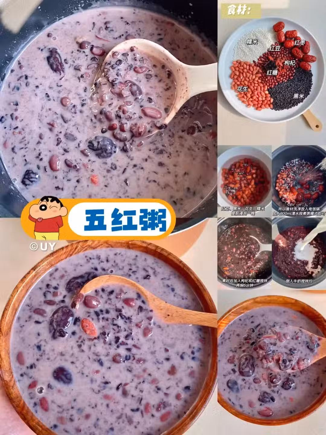 1️⃣食材提前凈泡一晚,放入電飯鍋煮一小時,煮好後加入枸杞和紅糖攪拌均勻