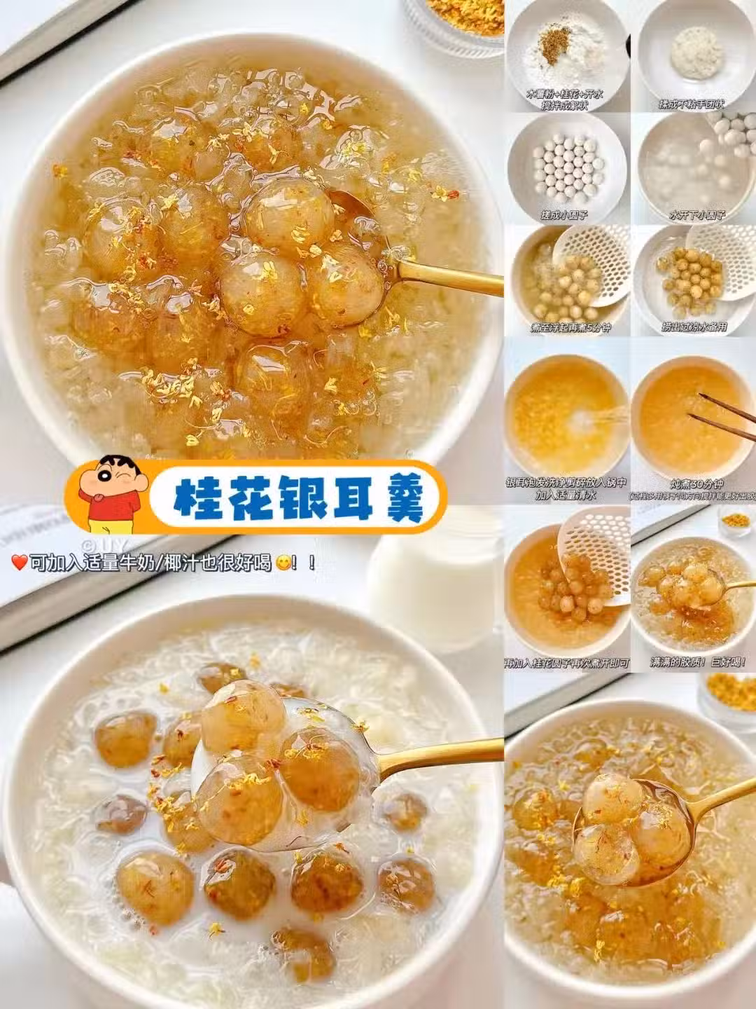 1️⃣木薯粉➕糖➕桂花碎混合,加入開水,揉成光滑的麵糰,搓成小丸子🍡煮熟後過涼備用。