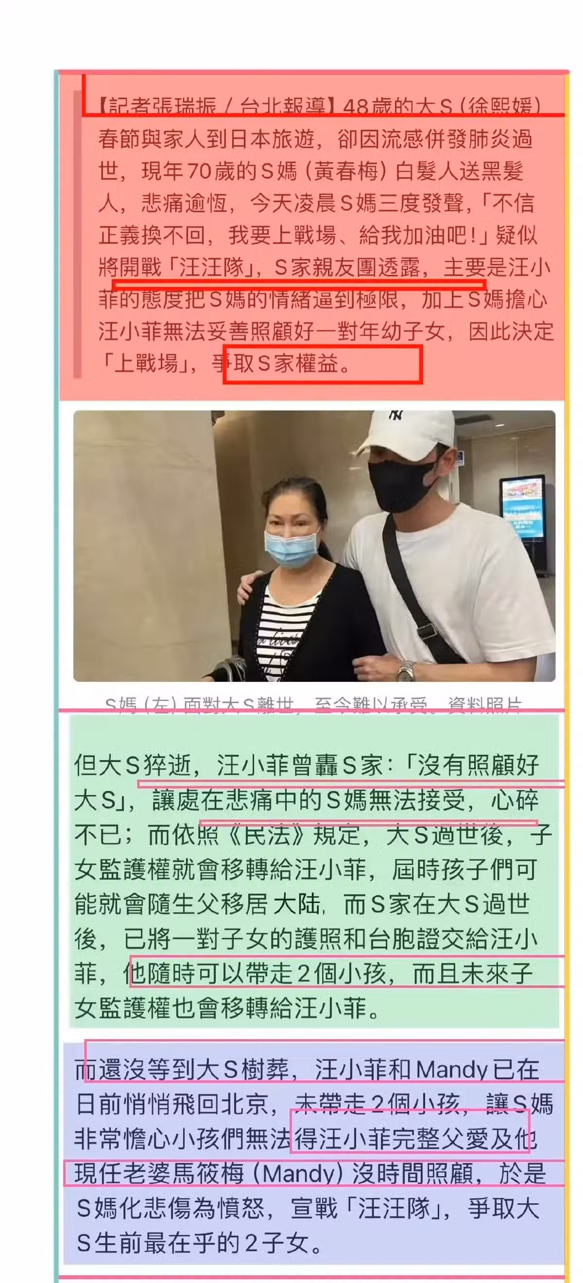 S家親友團還說汪小菲對S媽態度不好,把S媽逼到情緒崩潰,所以S媽不得不站出來維護S家的權益。