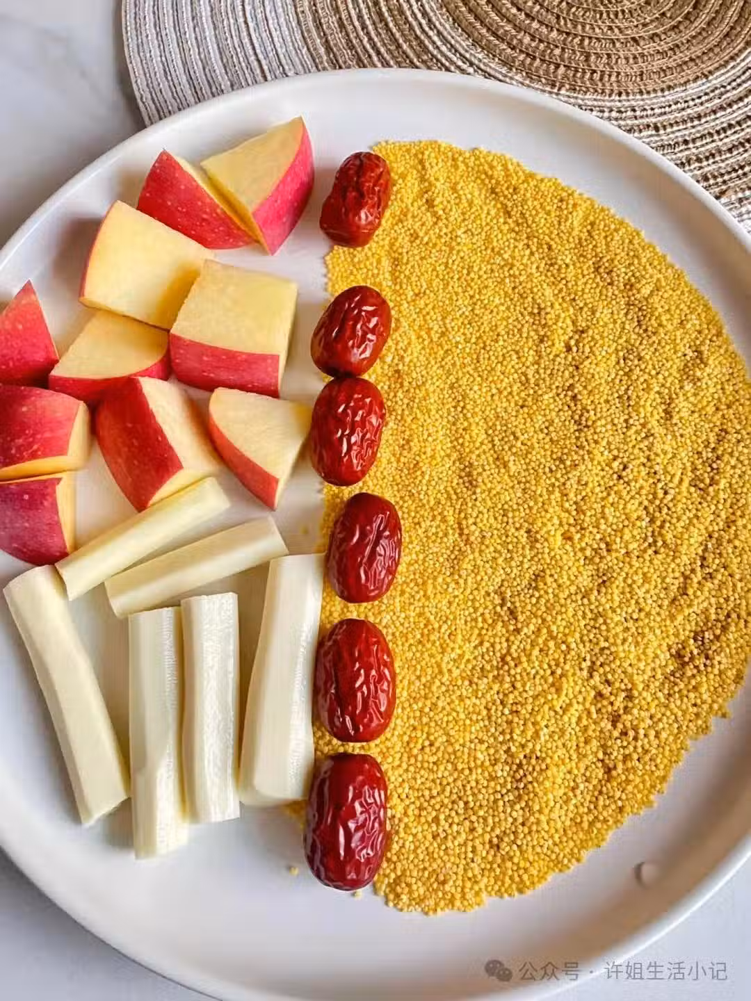 食材:蘋果半個、小米30g、山藥60g、紅棗4顆
