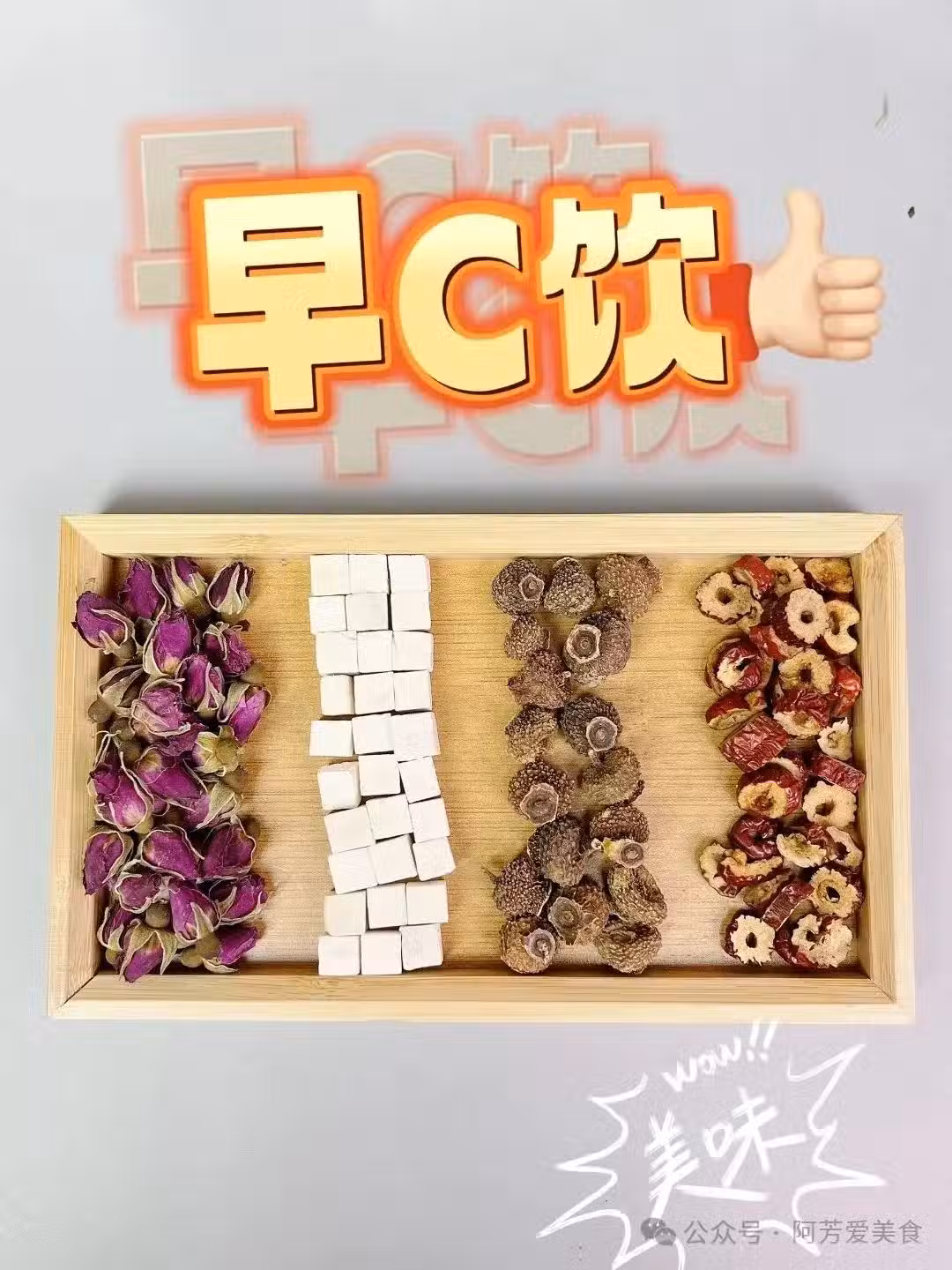 玫瑰花3朵+茯苓2個+刺梨3個+檸檬2個,玫瑰的芳香搭配紅棗的甜味,甜而不膩,還散發這花香,很是上頭。