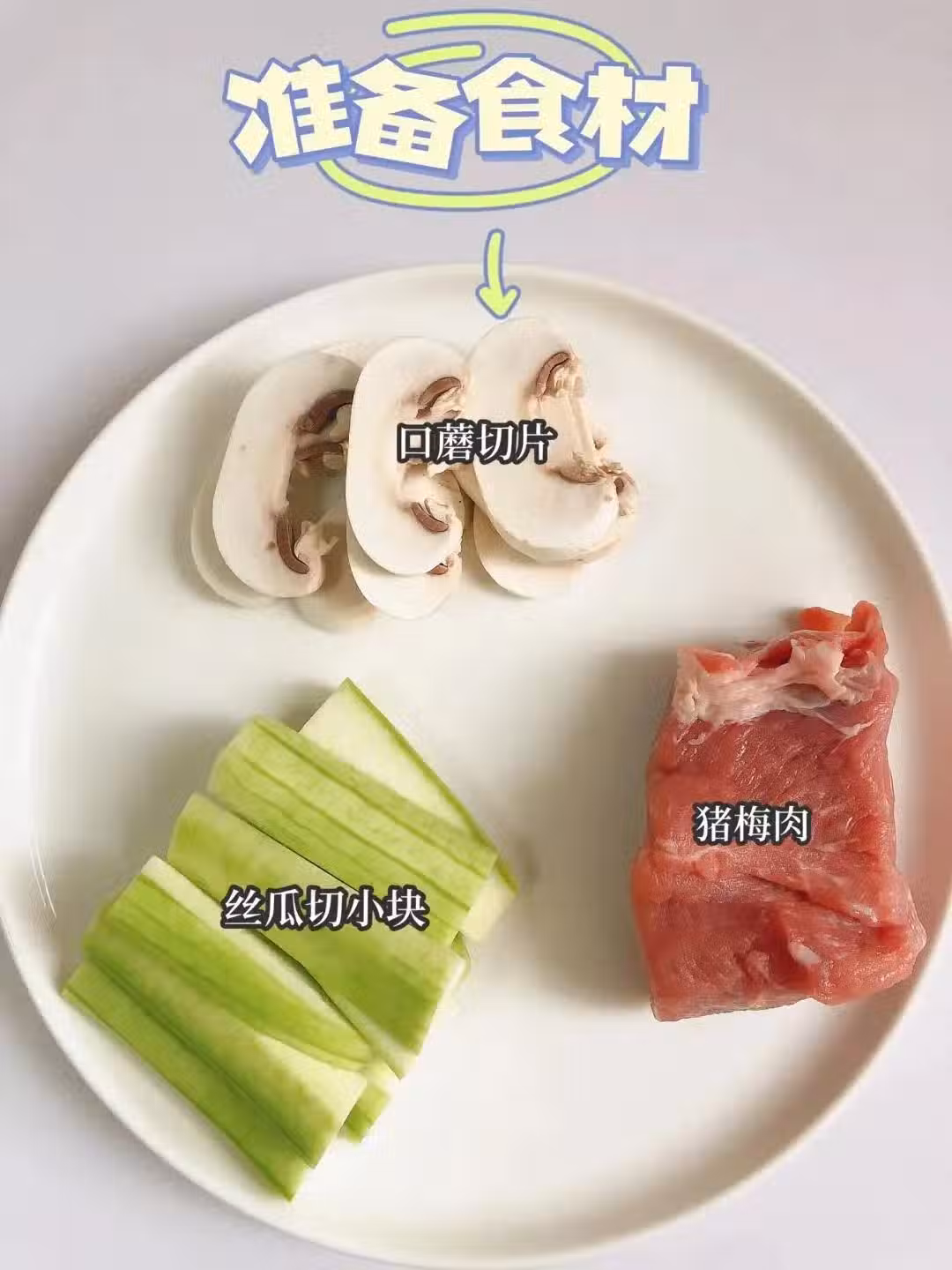 豬肉、鹽、澱粉、薑片、香菜、蘑菇、絲瓜