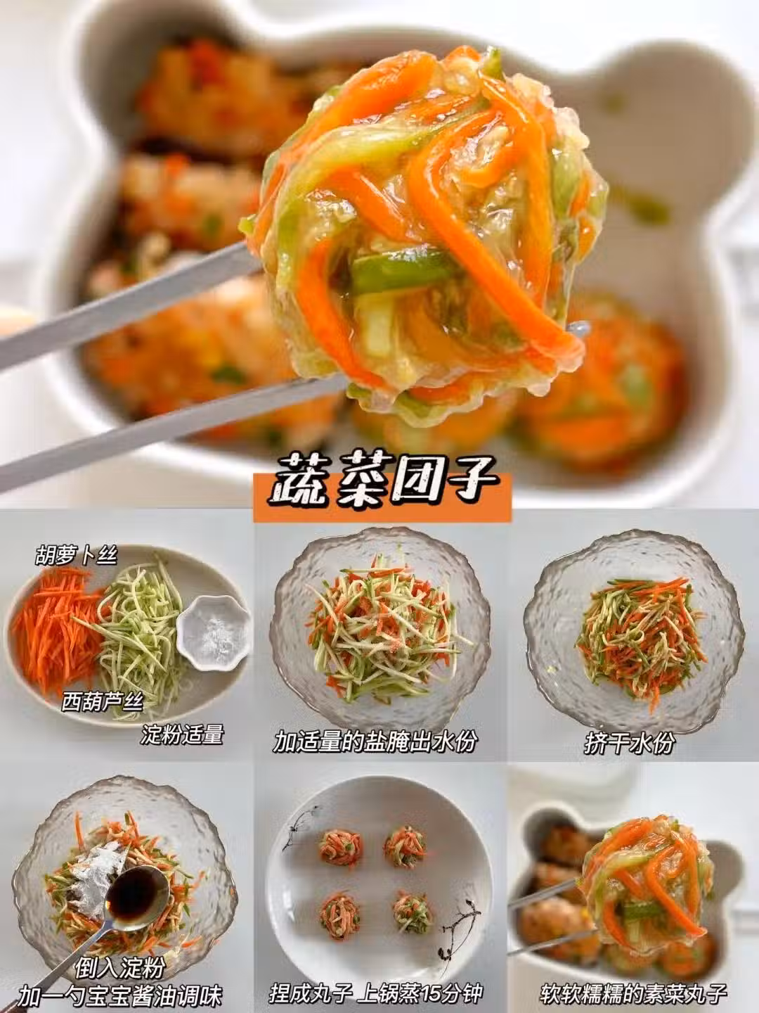 剩菜終結者,冰箱裡吃剩的胡蘿蔔、西葫蘆切絲,混澱粉搓成丸子蒸一蒸。