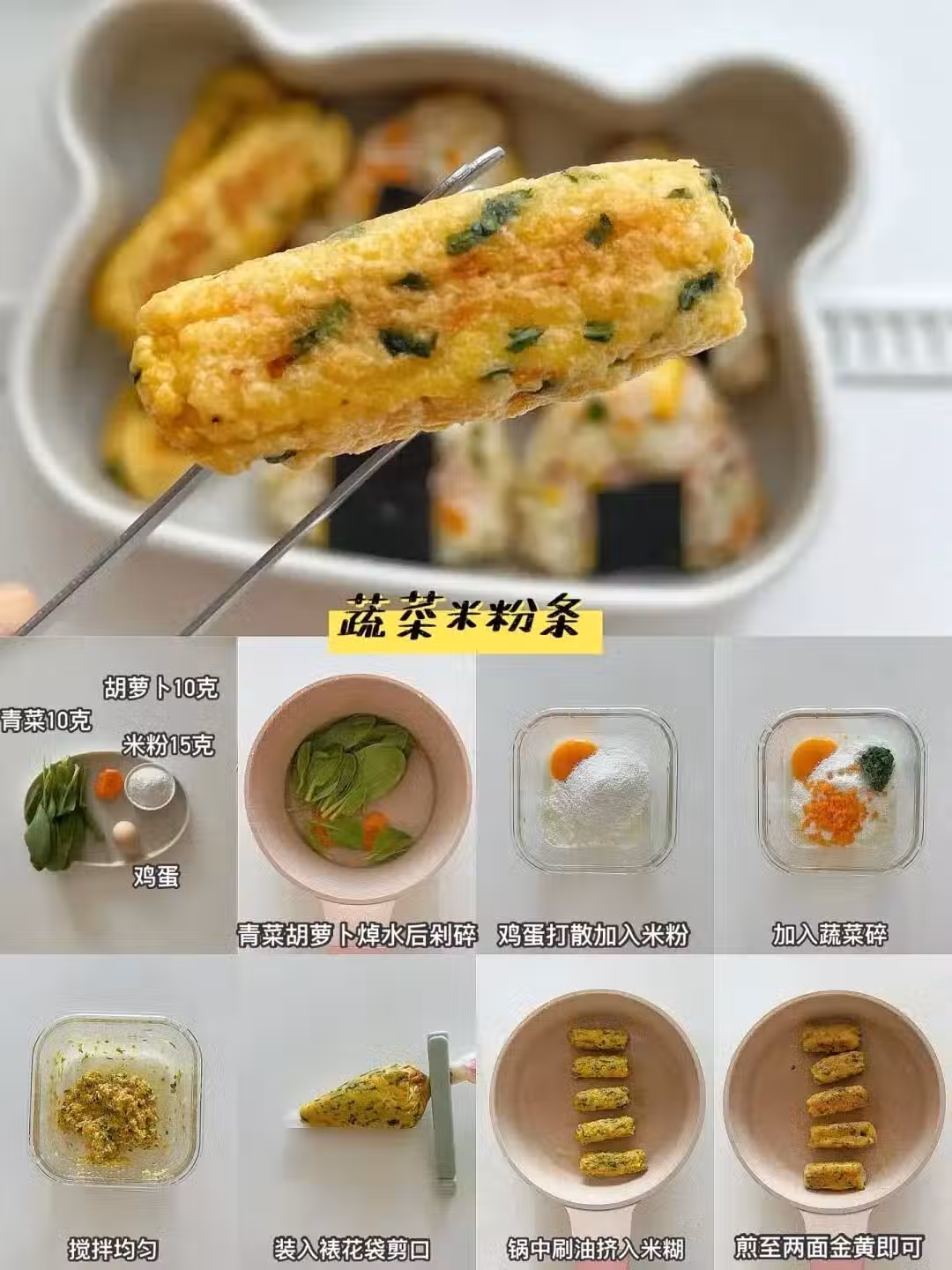 糊弄學天花板,胡蘿蔔青菜焯水切碎,加雞蛋米粉,拌勻搓成條,平底鍋再煎一煎。