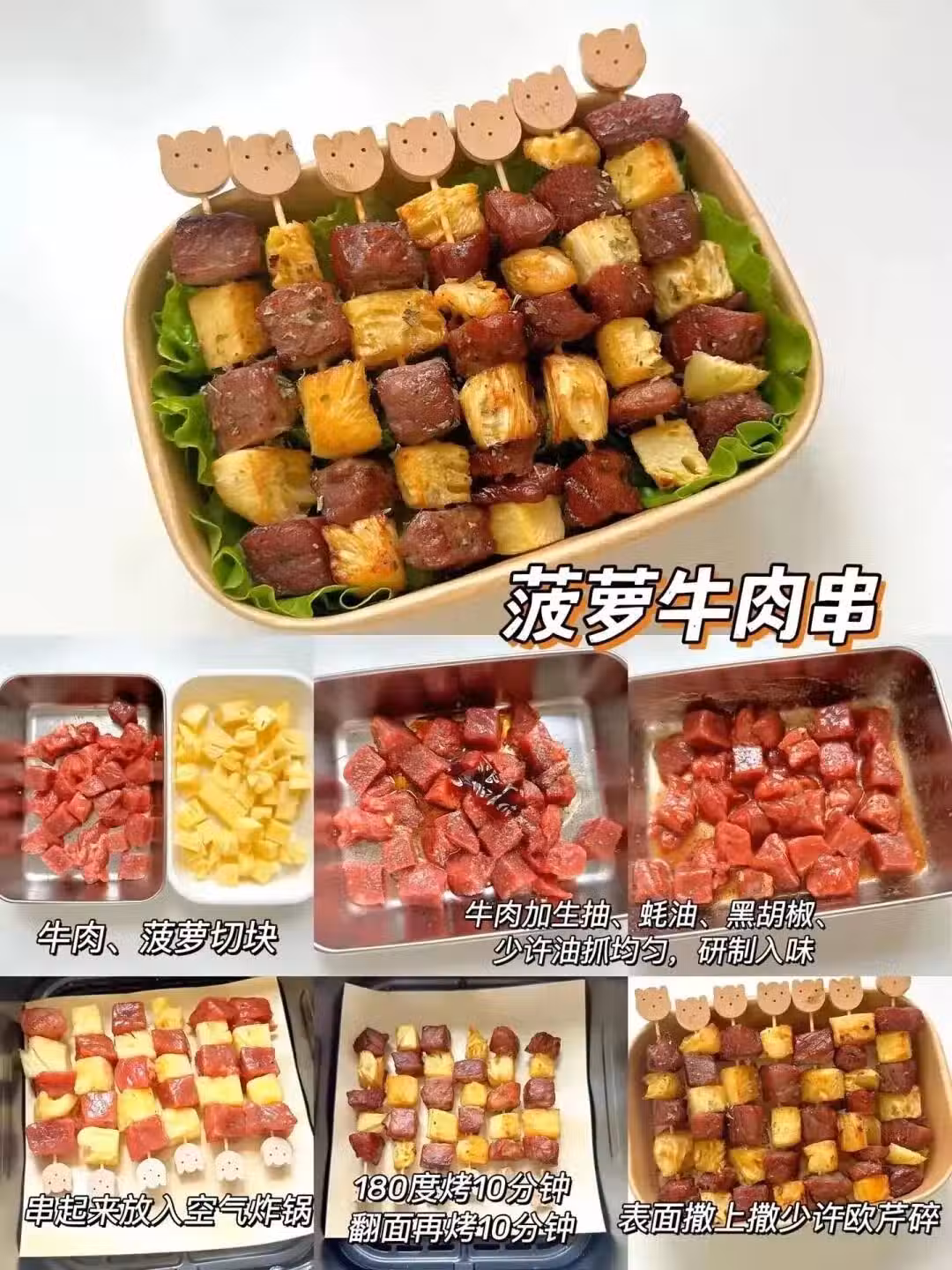 燒烤攤老闆看了連夜改行,牛肉粒和菠蘿塊交替串簽子,刷燒烤醬烤到微焦。