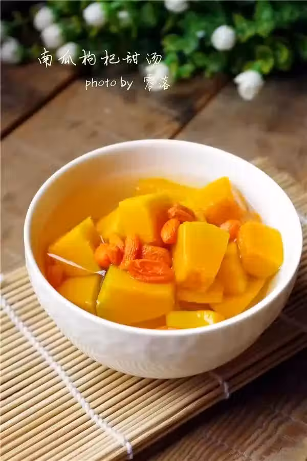 1. 南瓜去皮洗凈,切成方塊; 2. 枸杞用清水浸泡5分鐘,去掉雜質 3. 浸泡後的枸杞清洗乾淨備用; 4. 煮鍋置火上,放入南瓜塊、冰糖,倒入適量清水,喜歡喝湯就多放點水; 5. 南瓜煮熟的前5-10分鐘,放入枸杞; 6. 食材煮熟後,關火; 7. 溫暖的南瓜枸杞甜湯上桌咯。