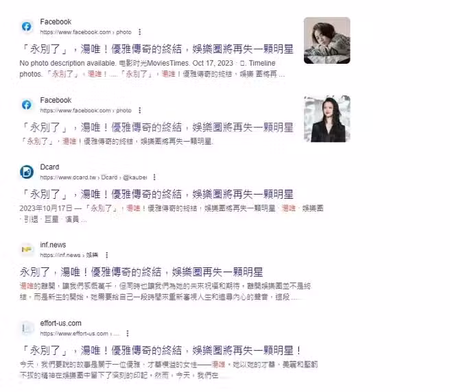 怎料近日,湯唯死訊突然在網上瘋傳,「湯唯去世」一詞甚至一度在Google搜尋引擎衝上熱搜,網絡上更出現了好幾篇標題為「永別了湯唯」的文章,讓粉絲震驚不已。