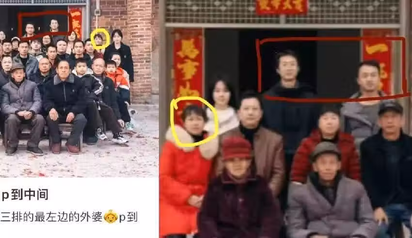 可不論哪種合照,將一位女性老人攆到邊上終究是不合適的。