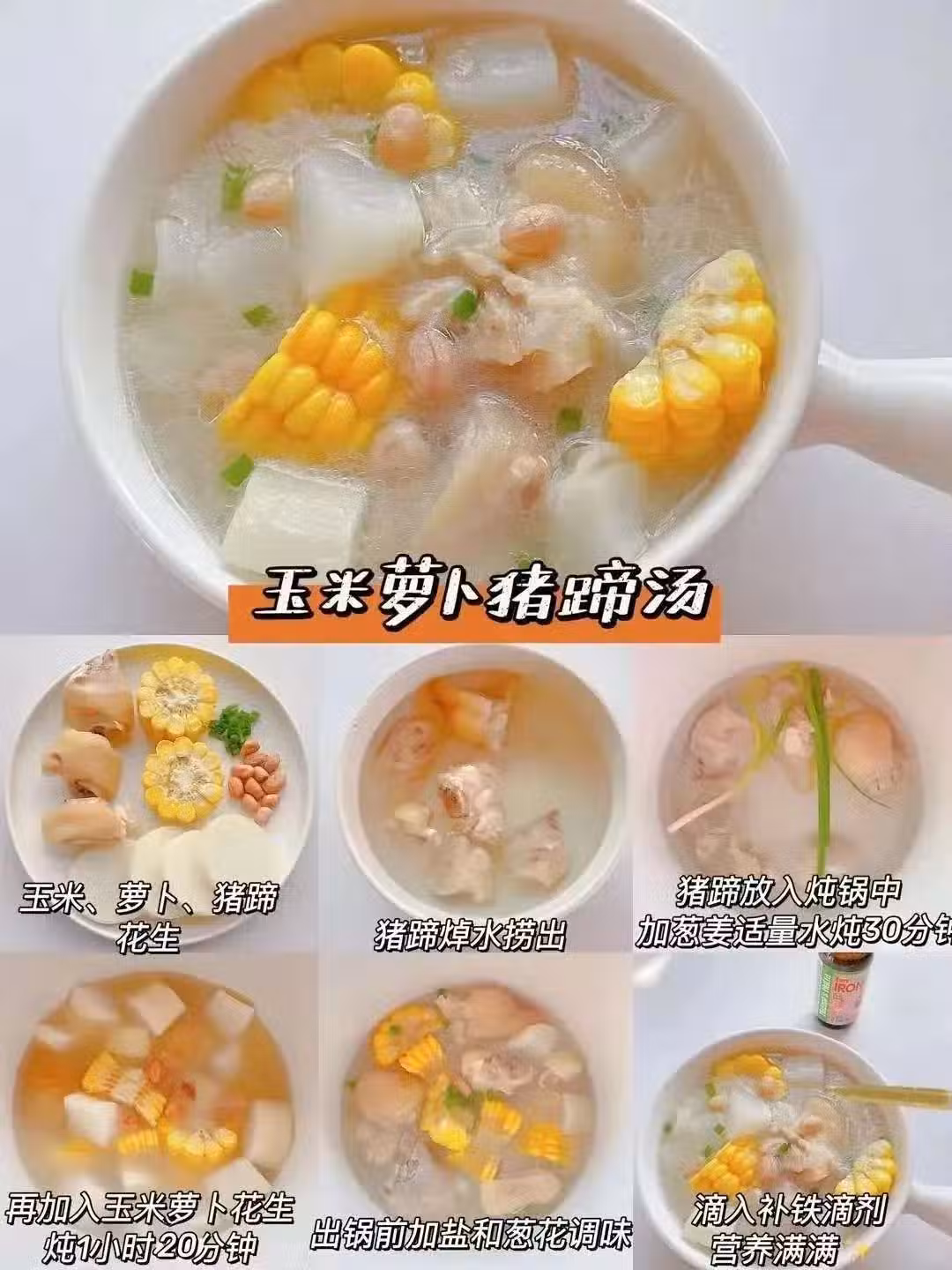 這款湯不僅富含鋅元素,而且豬蹄里的膠原蛋白也能促進孩子的骨骼發育,玉米和蘿蔔更是清爽營養,搭配一起,簡直是大補良方!