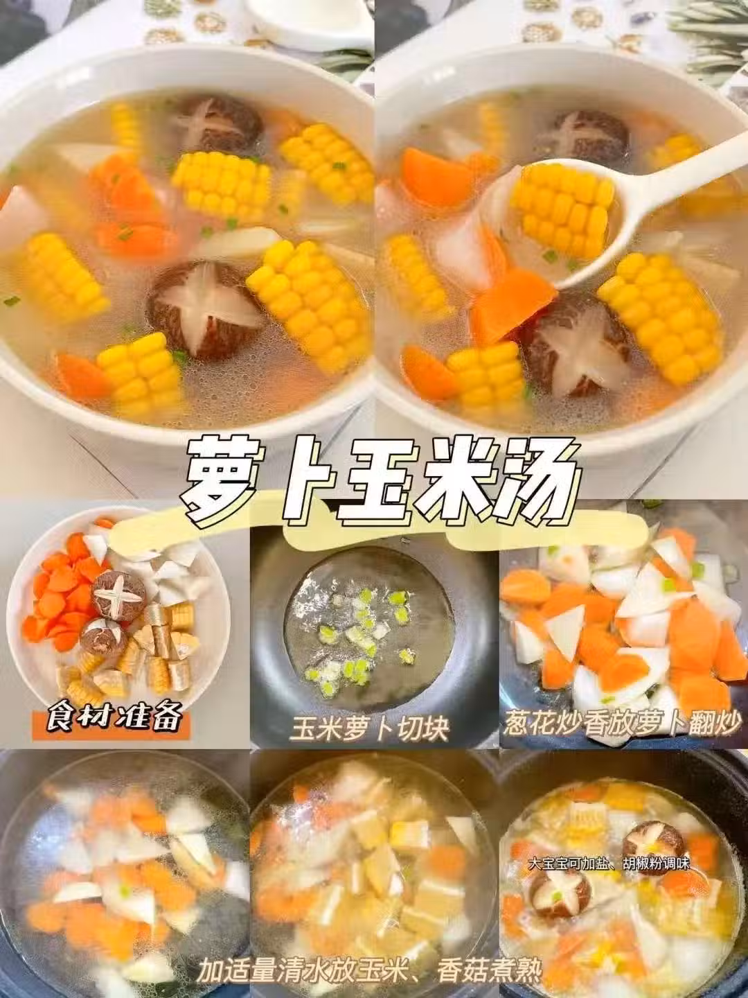 玉米和蘿蔔切塊,蔥花炒香後放入蘿蔔翻炒。
