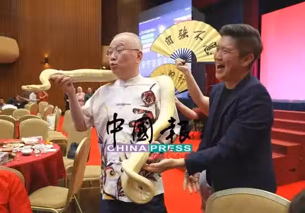 魏家祥(左)在台下交流時,身上環繞一條蛇合影留念。