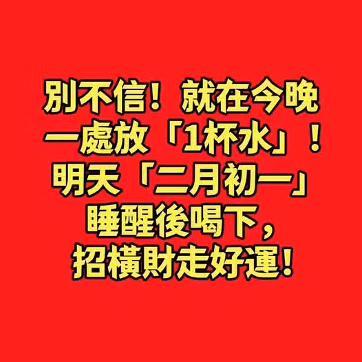🌟「二月初一」開運招財水法 在農曆二月初一(2025年2月28日),有些人會透過「一杯水」的小儀式來祈求財運亨通、好運連連。 水象徵財運,寓意「財如流水,源源不絕」。