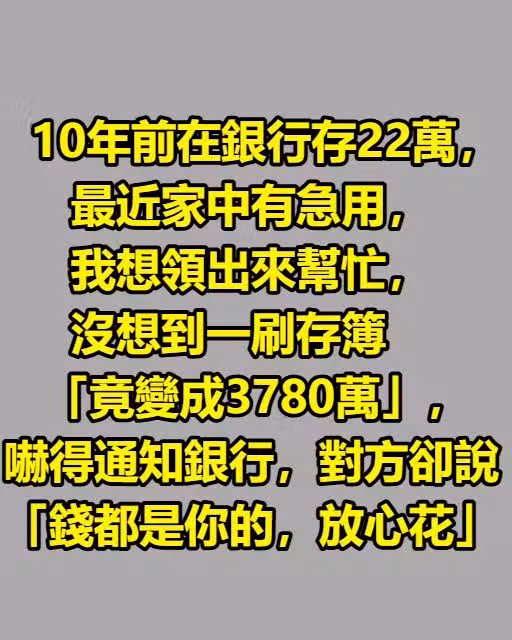10年前在銀行存22萬,最近家中有急用,我想領出來幫忙,沒想到一刷存簿「竟變成3780萬」,嚇得通知銀行…對方卻說「錢都是你的,放心花」