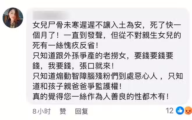 還有人的態度就犀利得多了,斥責S媽:女兒屍骨未寒遲遲不入土為安,從不對女兒的離世有一絲的愧疚反省,卻只顧著爭奪遺產,實在是不體面。