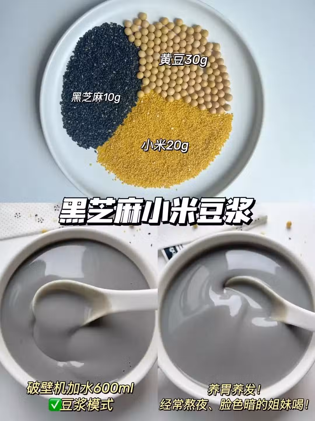 食材:黑芝麻10g、黃豆30g、小米20g 做法:黃豆泡發,與小米加600ml水打成漿,可加少量糖調味。 九、黑豆核桃豆漿(學生黨必備) 核桃健腦、黑米抗疲勞,備考熬夜時喝,護髮同時提神醒腦。