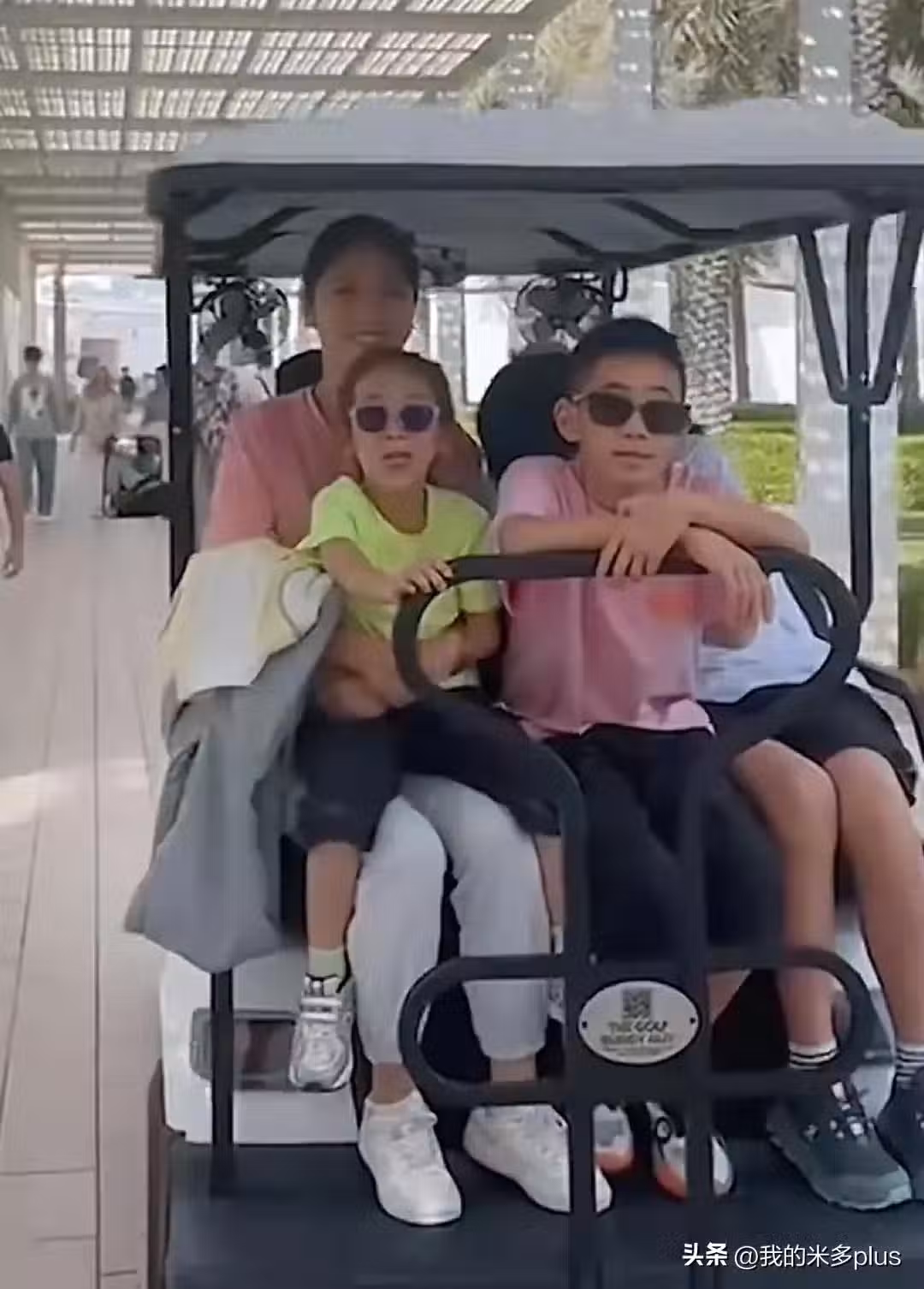 一家人坐著觀光車出門,Jasper和弟弟緊挨著,兄弟倆都戴著墨鏡扮酷,哥倆長相太像了。------------------------------------